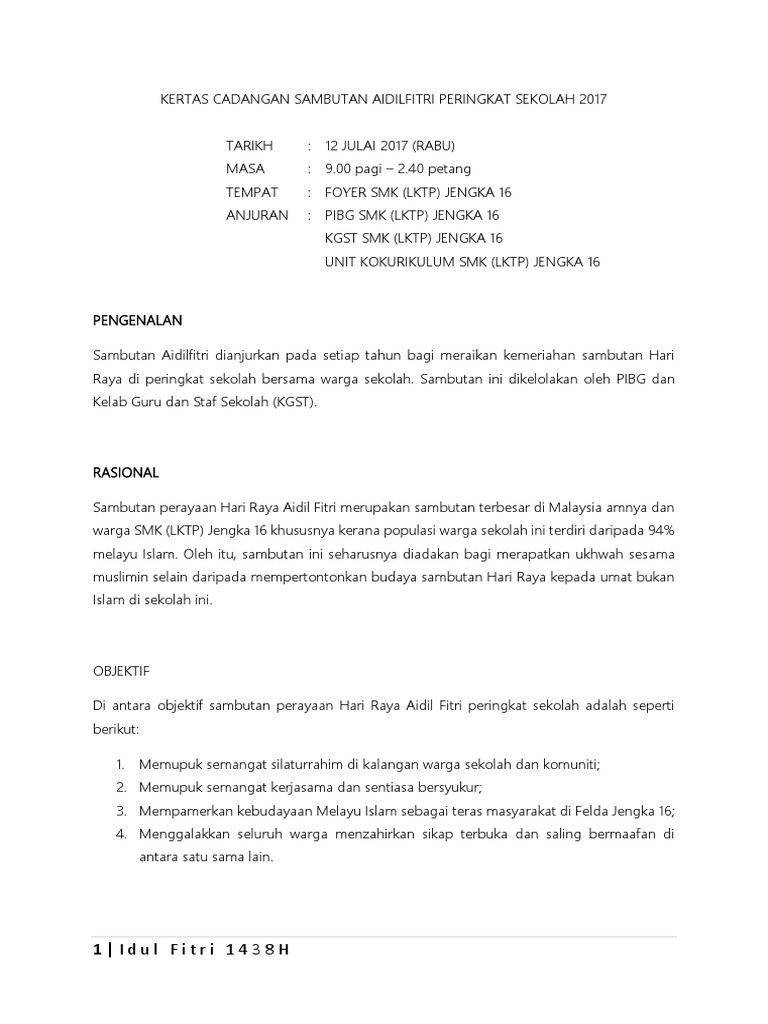 Kertas kerja program sambutan hari raya aidilfitri peringkat sekolah kebangsaan kampung busut baru a tahun 2014 tarikh 8 ogos 2014 tempat kelas tahun 1 skkbba anjuran guru pelatih ipg kpi dengan kerjasama guru guru sekolah kebangsaan busut baru asli skkbba 10 tujuan kertas kerja ini disediakan bertujuan untuk memohon kelulusan daripada. Puan nurul izza nordin 013 8500362. Jemputan ke majlis sambutan hari raya aidilfitri 1432h gabungan majlis presiden dan setiausaha kehormat kesatuan kakitangan universiti malaysia gakum di universiti sains islam malaysia tarikh.