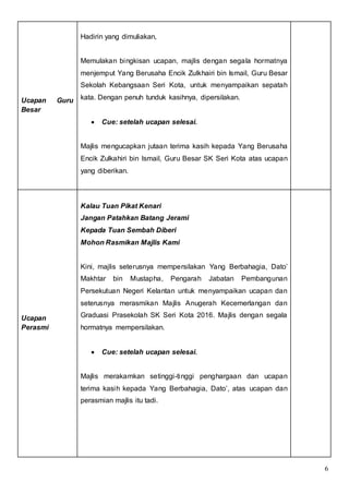 Teks Ucapan Pengacara Majlis Malam Kebudayaan Galau Id. Teks Pengacara Majlis Anugerah Kecemerlangan Dan Graduasi Prasekolah. 1 TEKS PENGERUSI MAJLIS ANUGERAH KECEMERLANGAN DAN GRADUASI PRASEKOLAH SK SERI KOTA 2016 Hadirin yang dimuliakan Majlis akan bermula sebentar sahaja lagi untuk itu tuan-tuan dan puan-puan serta hadirin sekalian diminta mengambil tempat di dalam dewan.