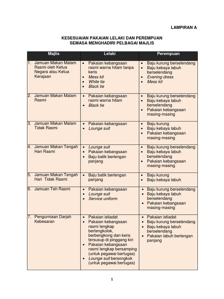 Cara berpakaian majlis makan malam rasmi ketua negara atau kerajaan. KAWALAN KESELAMATAN RAHSIA RASMI DAN DOKUMEN RASMI KERAJAAN. TANGGUNGJAWAB PEGAWAI 5 5. PENGURUSAN KOKURIKULUM WAJ3081 ffff KESESUAIAN PAKAIAN MAJLIS PEREMPUAN LELAKI 1.