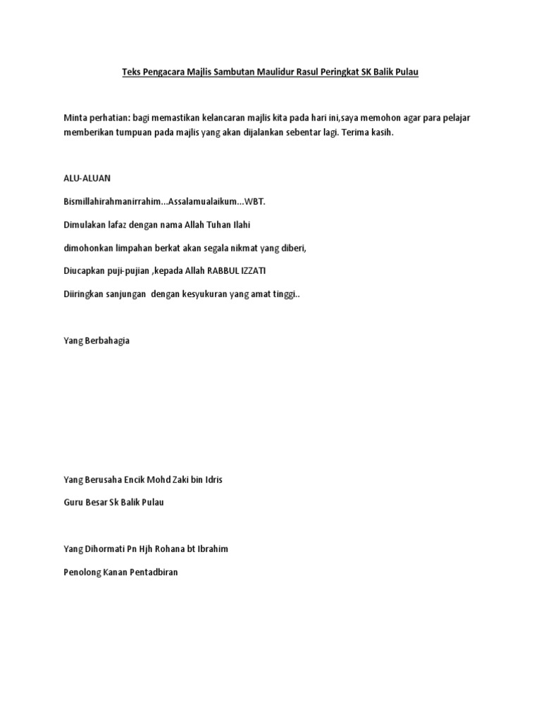 Teks pengacara majlis maulidur rasul 1. Teks pengacara majlis mc untuk majlis sambutan maulidur rasul peringkat sekolah menengah dan rendah. TEKSJURUACARA SAMBUTAN MAULIDUR RASULPERINGKAT SEKOLAH BECHAH DURIAN PASIR MAS KELANTAN TAHUN 2012 15 FEBRUARI 2012 OLEH.
