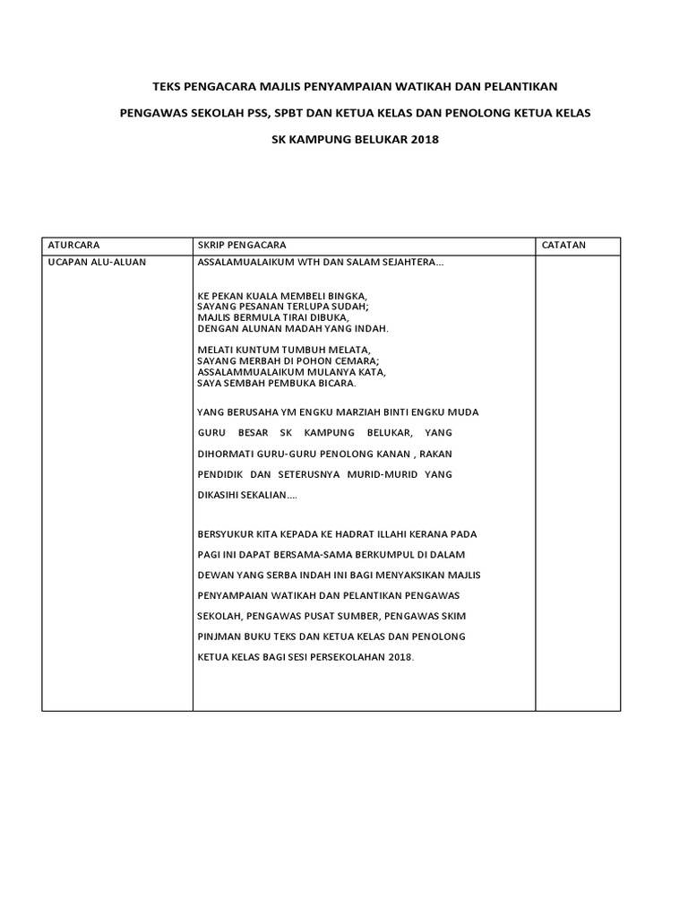 Dengan penuh keikhlasan bersama-samalah kita lafazkan kesyukuran ke hadrat Ilahi kerana dengan limpah kurnia-Nya dapat kita hadir ke Majlis Penyampaian Watikah Pelantikan Pengawas Pengawas Pusat Sumber Sekolah Pengawas SPBT dan Ketua dan Penolong Ketua Kelas Peringkat Sekolah Kebangsaan Kubor Datu Jaya diberkati Allah swt. Sekali lagi dipanjatkan syukur ke hadrat ilahi kerana dengan limpah kurnia-Nya kita dapat berhimpun dalam Majlis Pelantikan Kepimpinan Pengawas SMK Tinggi Bukit Mertajam bagi tahun 2016. Teks ucapan pengacara majlis sambutan hari guru dan pekerja sk bangsar teks juruacara majlis 4 transformasi 2014 18 transformasi pss 2013 7 ke arah pusat sumber skb cemerlang arkib rekod terdahulupertandingan melukis kulit.