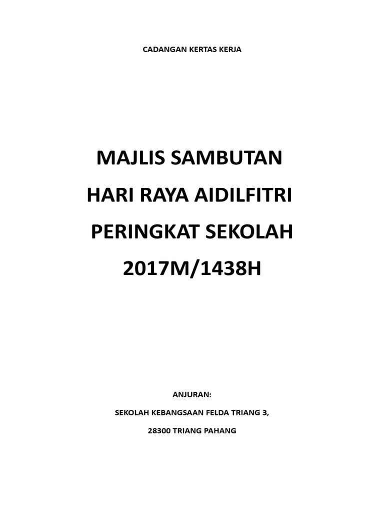 Kertas kerja program sambutan hari raya aidilfitri peringkat sekolah kebangsaan kampung busut baru a tahun 2014 tarikh 8 ogos 2014 tempat kelas tahun 1 skkbba anjuran guru pelatih ipg kpi dengan kerjasama guru guru sekolah kebangsaan busut baru asli skkbba 10 tujuan kertas kerja ini disediakan bertujuan untuk memohon kelulusan daripada. Puan nurul izza nordin 013 8500362. Jemputan ke majlis sambutan hari raya aidilfitri 1432h gabungan majlis presiden dan setiausaha kehormat kesatuan kakitangan universiti malaysia gakum di universiti sains islam malaysia tarikh.